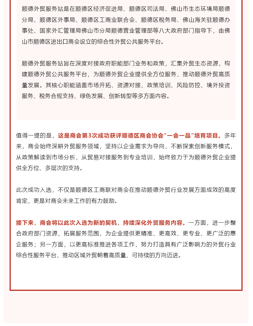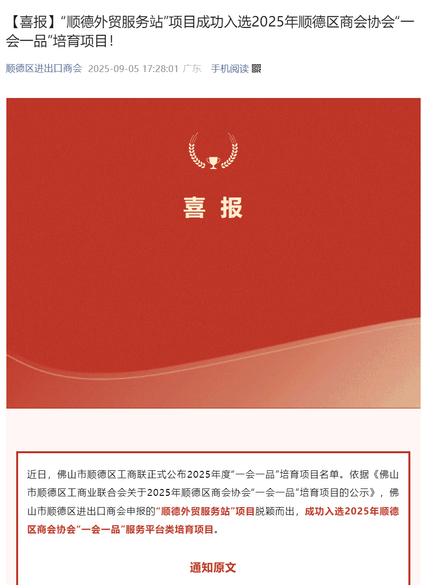 【喜报】“顺德外贸服务站”项目成功入选2025年顺德区商会协会“一会一品”培育项目!