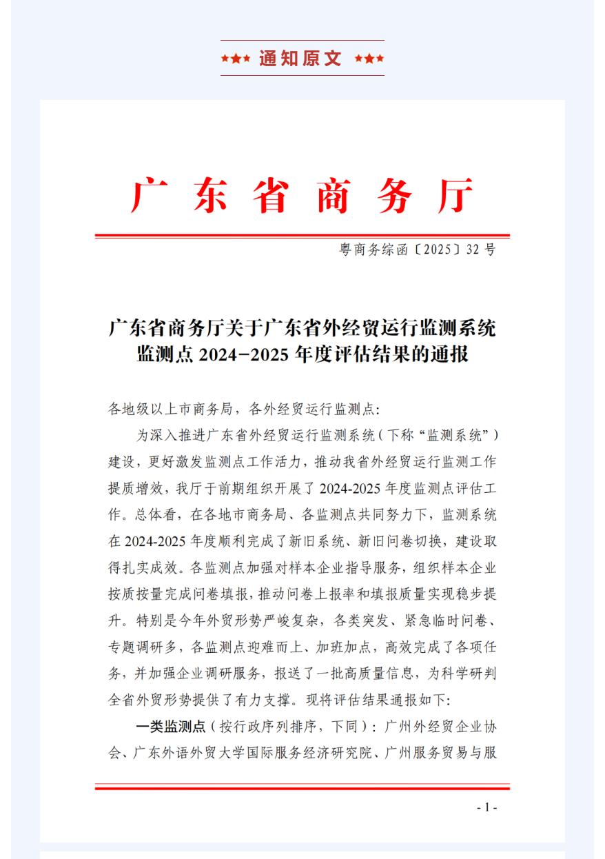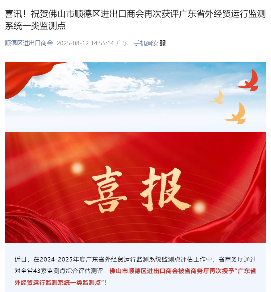 喜讯!祝贺佛山市顺德区进出口商会再次获评广东省外经贸运行监测系统一类监测点